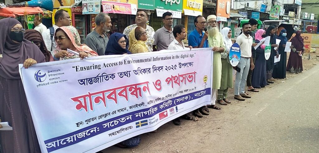 নাটোর অবিলম্বে স্বাধীন তথ্য কমিশন গঠন করতে হবে স্লোগানে আন্তর্জাতিক তথ্য অধিকার দিবস উপলক্ষে রবিবার সকাল ১০টায় সচেতন নাগরিক কমিটি (টিআইবি)নাটোর শাখার উদ্যোগে মানব বন্ধন করা হয়। অপরদিকে জেলা প্রশাসনের উদ্যোগে জেলা প্রশাসকের কনফারেন্স রুমে অনুষ্ঠিত হয় আলোচনা সভা । সচেতন নাগরিক কমিটির সভাপতি রেজাউল করিম রেজার সভাপতিত্বে মানব বন্ধনে বক্তব্য রাখেন দুর্নীতি প্রতিরোধ কমিটি নাটোর জেলা শাখার সভাপতি অধ্যক্ষ আব্দুর রাজ্জাক, আদিবাসী পরিষদ নাটোর জেলা শাখার সভাপতি নরেশ কুমার উরাও, এনজিও প্রতনিধি মাকসুদা বেগম, সচেতনতন নাগরিক কমিটি নাটোর শাখার সহ সভাপতি শিবলি সাদিক প্রমুখ। সভায় বক্তারা বলেন, একটি গণতান্ত্রিক রাষ্ট্র ব্যবস্থায় গণতন্ত্র, সুশাসন ও জবাবদিহীতা নিশ্চিত করার জন্য ২০০৯ সালে তথ্য অধিকার আইন পাস করা হয়। এই আইনের আওতায় দেশের সার্বভৌমত্ব বিপন্ন হতে পারে এমন কয়েকটি বিষয়বাদে তথ্য প্রদানে সংশ্লিষ্ট কর্তৃপক্ষ বাধ্য। কিন্তু এখনও এই আইনটি বাস্তবায়নে কোন কোন অফিস নানা ভাবে কালক্ষেপন ও তথ্য প্রদানে অনিহা লক্ষ্য করা যায়। এমবস্থায় স্বাধীন তথ্য কমিশন গঠন গণতন্ত্রের জন্য জরুরী। কারণ একটি গণতান্ত্রিক রাষ্ট্রে তথ্যই শক্তি হিসেবে কাজ করে।