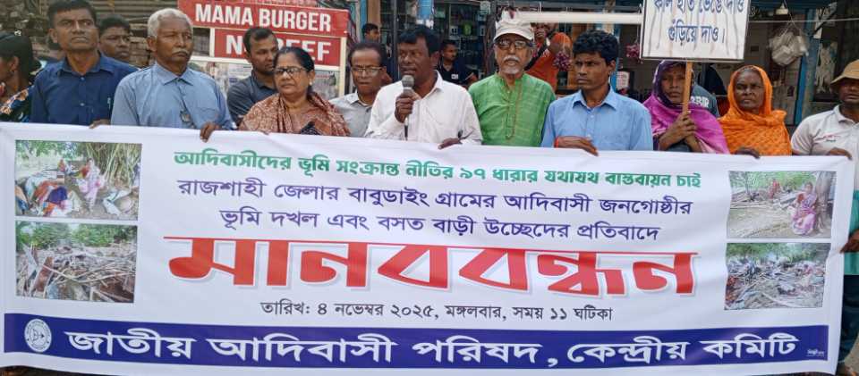 রাজশাহীর গোদাগাড়ী উপজেলার বাবু ডাইং গ্রামের আদিবাসীদের ভ’মি দখল ও উচ্ছেদের প্রতিবাদে মানববন্ধন কর্মসূচী পালন করেছে জাতীয় আদিবাসী পরিষদ। মঙ্গলবার সকালে রাজশাহী শহরের সাহেব বাজার এলাকায় সংগঠনটির কেন্দ্রীয় কমিটির আয়োজনে মানববন্ধন কর্মসূচীতে অন্যান্যের মধ্যে বক্তব্য রাখেন কেন্দ্রীয় কমিটির সভাপতি গনেশ মার্ডি, সিনিয়র সহসভাপতি রাজকুমার সাও, সাধারণ সম্পাদক বিমল চন্দ্র রাজোয়ার, কেন্দ্রীয় সদস্য আন্দ্রিয়াস বিশ্বাস, রাজশাহী জেলা কমিটির সাধারণ সম্পাদক মুকুল বিশ্বাস, সুশীল সমাজ প্রতিনিধি অ্যাড. ঘাসিবুল ইসলাম, বরেন্দ্র বহুমূখী প্রকল্পের সমন্বয়কারী ফয়েজুল্লাহ চৌধুরী, বাংলাদেশ মহিলা পরিষদ রাজশাহী জেলা শাখার সাধারণ সম্পাদক নিলুফা আহমেদ, এনজিও প্রতিনিধি রাশেদ রিপন, বীর মুক্তিযোদ্ধা মাহাবুব জামান কাদেরী প্রমূখ।